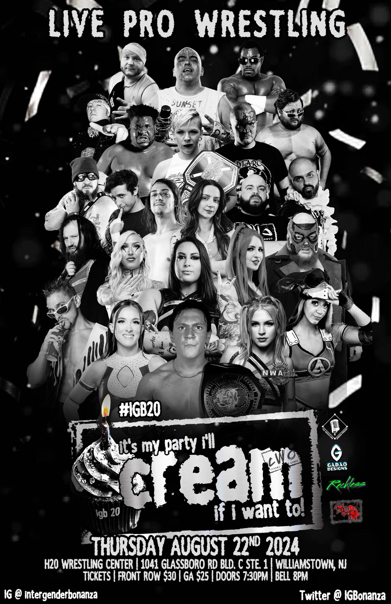 Intergender Bonanza 8/22/24 IGB 20: It’s My Party I’ll CREAM If I Want To results from the H2O Wrestling Center in Williamstown, New Jersey. The event streamed live on IWTV.