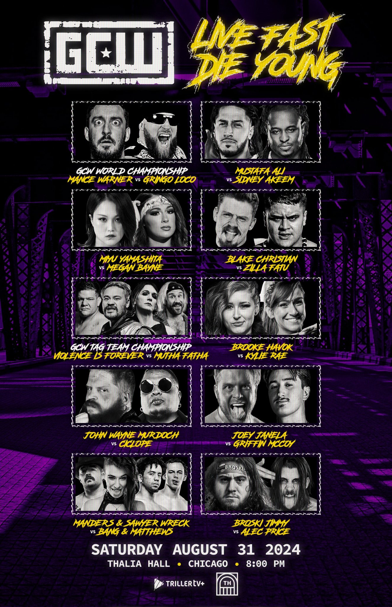 Game Changer Wrestling 8/31/24 GCW Live Fast Die Young results from Thalia Hall in Chicago, Illinois. The event streamed live on TrillerTV+.