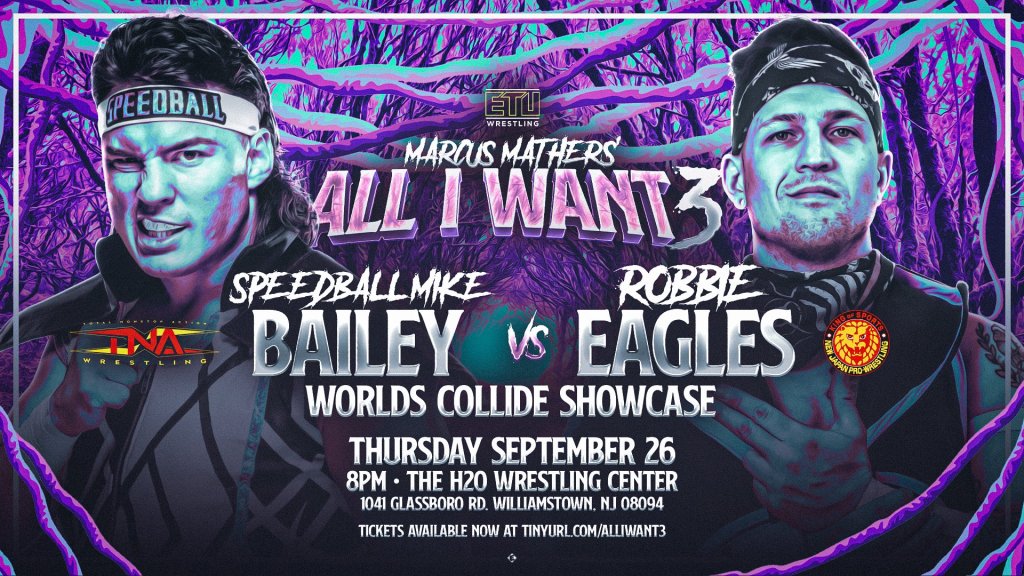 On September 26th, ETU will present the third annual, “Marcus Mathers’ All I Want 3.” The show is truly shaping up to be can’t-miss, with a couple of banger matches already annoounced. Today we added to that with “Speedball” Mike Bailey being announced to go one-on-one with Robbie Eagles.