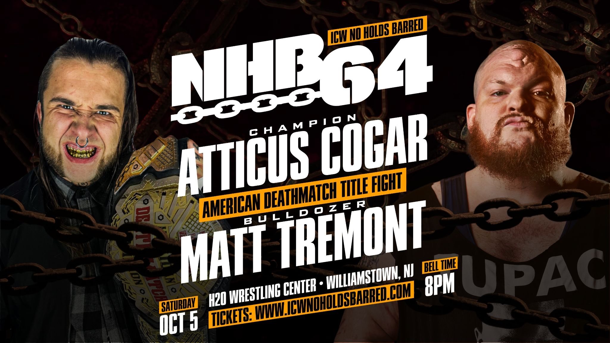 NHB 64 will take place on Saturday October 5th at the H2O Wrestling Center in Williamstown, New Jersey. Tickets are available at ICWNOHOLDSBARRED.COM. The show is also scheduled to stream live on IWTV.