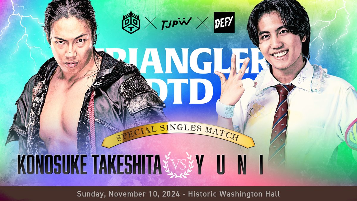 The following night DDTxTJPWxDEFY will hold a supershow “Triangler DTD”. Konosuke Takeshita vs Yuni has been added that event. Daisuke Sasaki, Danshoku Dieno, MAO, Gringo Loco, Shota, Yoshihiko, Miu Watanabe, Suzume, Arisu Endo, Yuki Kamifuku, Miyu Yamashita, Shoko Nakajima, Rika Tatsumi, Mizuki, Maki Itoh, Yuki Aino, Moka Miyamoto, and Wakana Uehara have all been previously announced for the show.