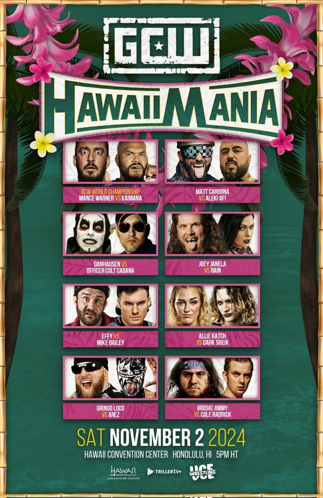 Game Changer Wrestling 11/2/2024 GCW HawaiiMania results from the Hawaii Convention Center in Honolulu, Hawaii. The event streamed live on TrillerTV.