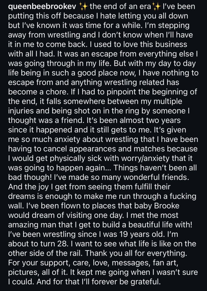 In the announcement Brooke states that she has always used wrestling as an escape, but her day-to-day life has been so good that she has not needed that escape. She also states that she has had multiple injuries and an incident in the ring has caused her to have major anxiety going into matches.
