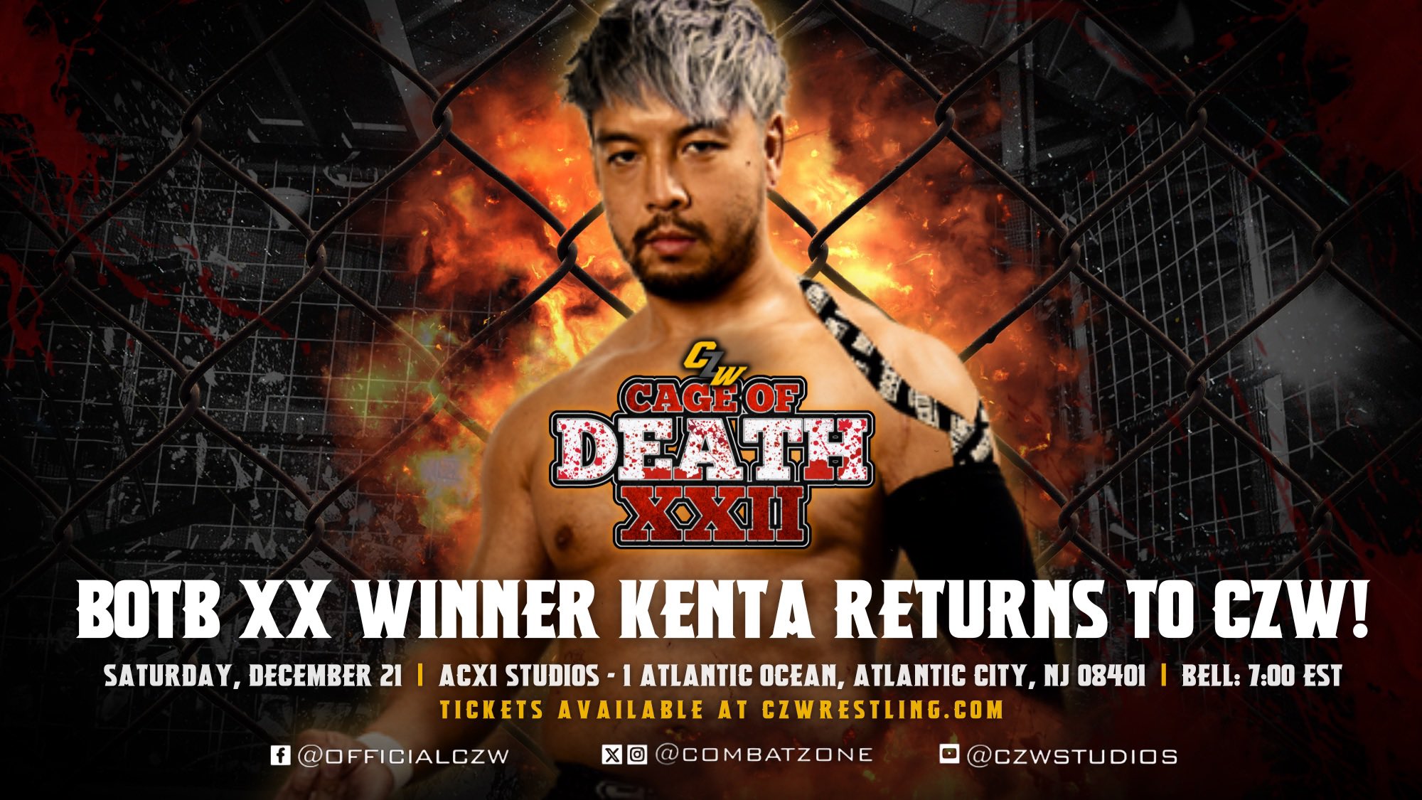 CZW Cage of Death XXII will take place at ACX1 Studios in Atlantic City, New Jersey. Tickets available at CZWrestling.com.