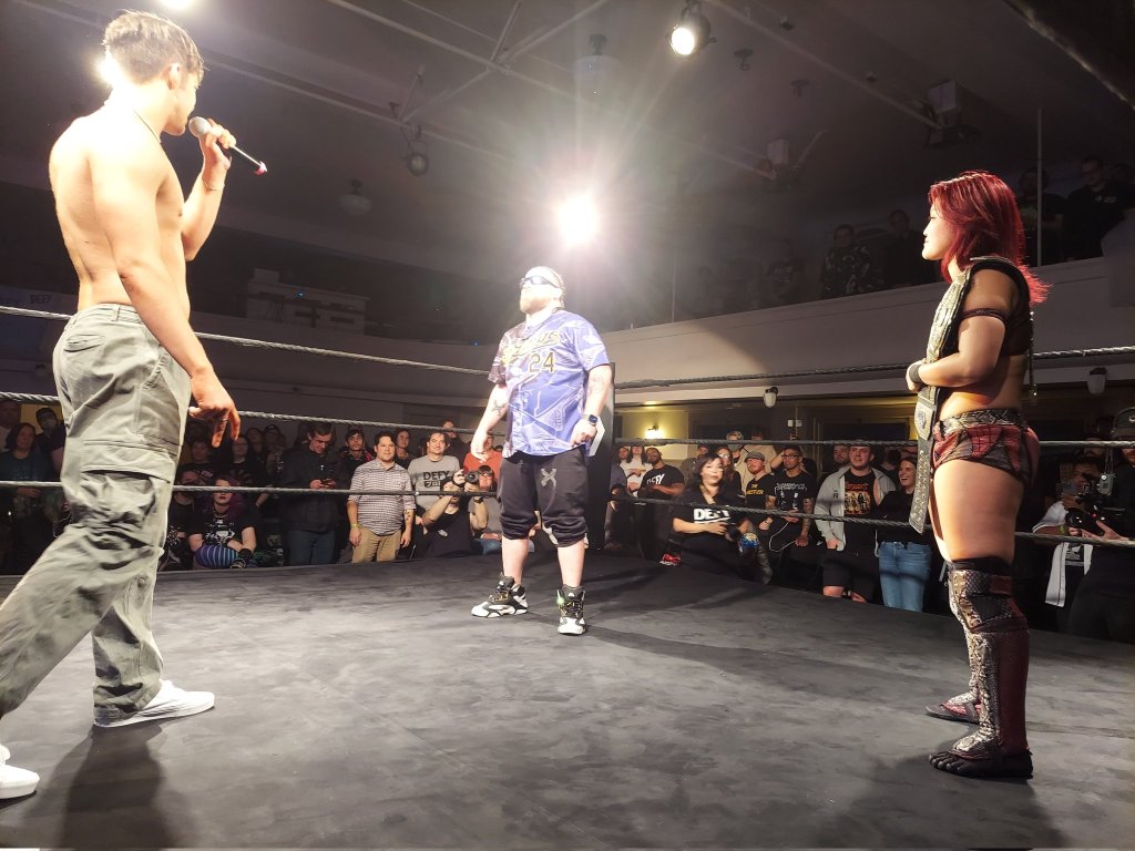 Nick Wayne enters the equation and has issue with Gringo Loco calling the fans at Washington Hall “his people”. He states that Washington Hall knows all about Nick Wayne winning belts. He then challenges Gringo and Miyu to a three way match. The champion Miyu Yamashita accepts the challenge stating “I’ll destroy you both!”