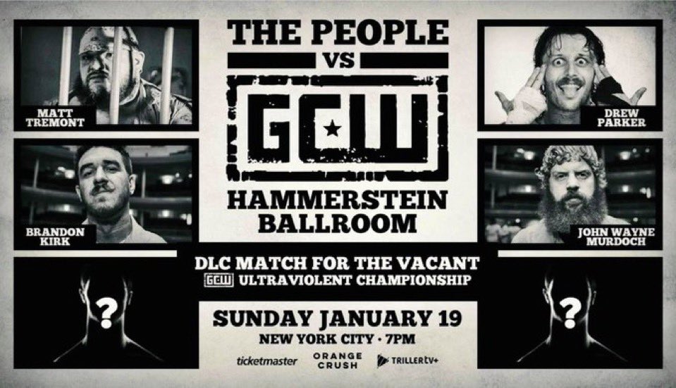In the final of the three announcements, four participants were revealed for a DLC (Doors, Ladders and Chairs) Match for the vacant GCW Ultraviolent Championship. It will be “The Bulldozer” Matt Tremont, Brandon Kirk, Drew Parker and John Wayne Murdoch, with two mystery participants that have yet to be revealed.