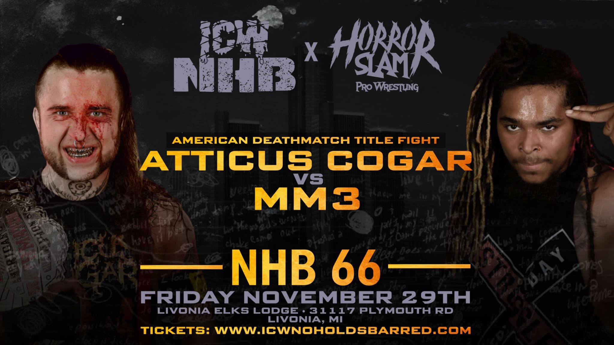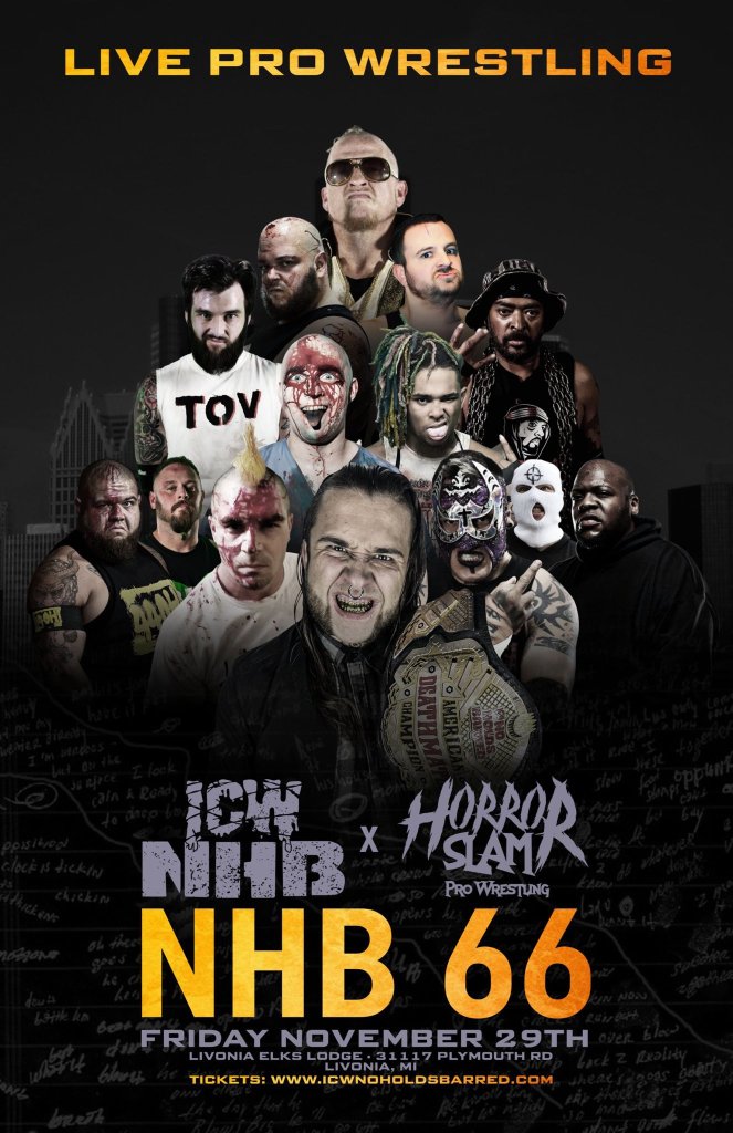 ICW No Holds Barred x Horror Slam 11/29/2024 ICW NHB 66 results from the Livonia Elks Lodge in Livonia, Michigan. The event streamed live on IWTV.