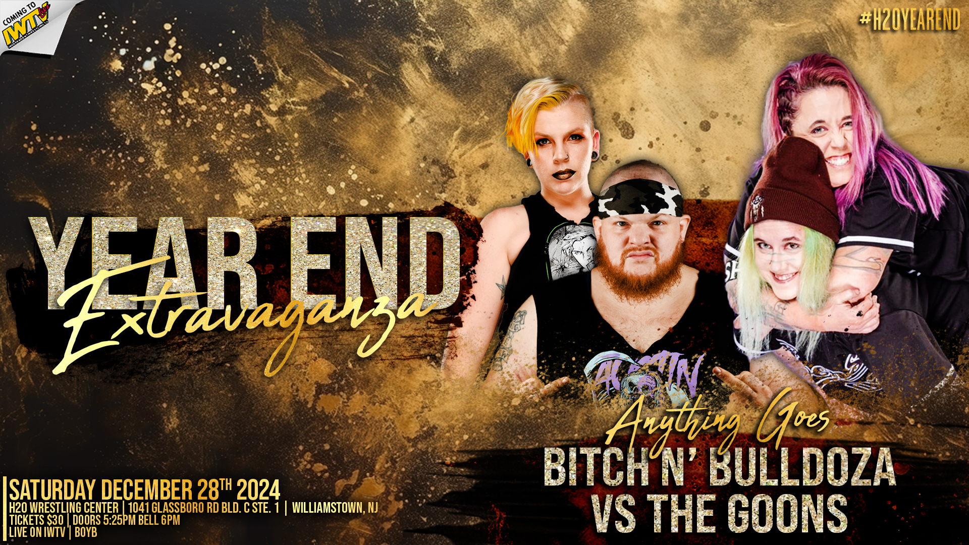 H2O Wrestling 12/28/2024 Year End Extravaganza results from the H2O Wrestling Center in Williamstown, New Jersey. The event streamed live on IWTV.