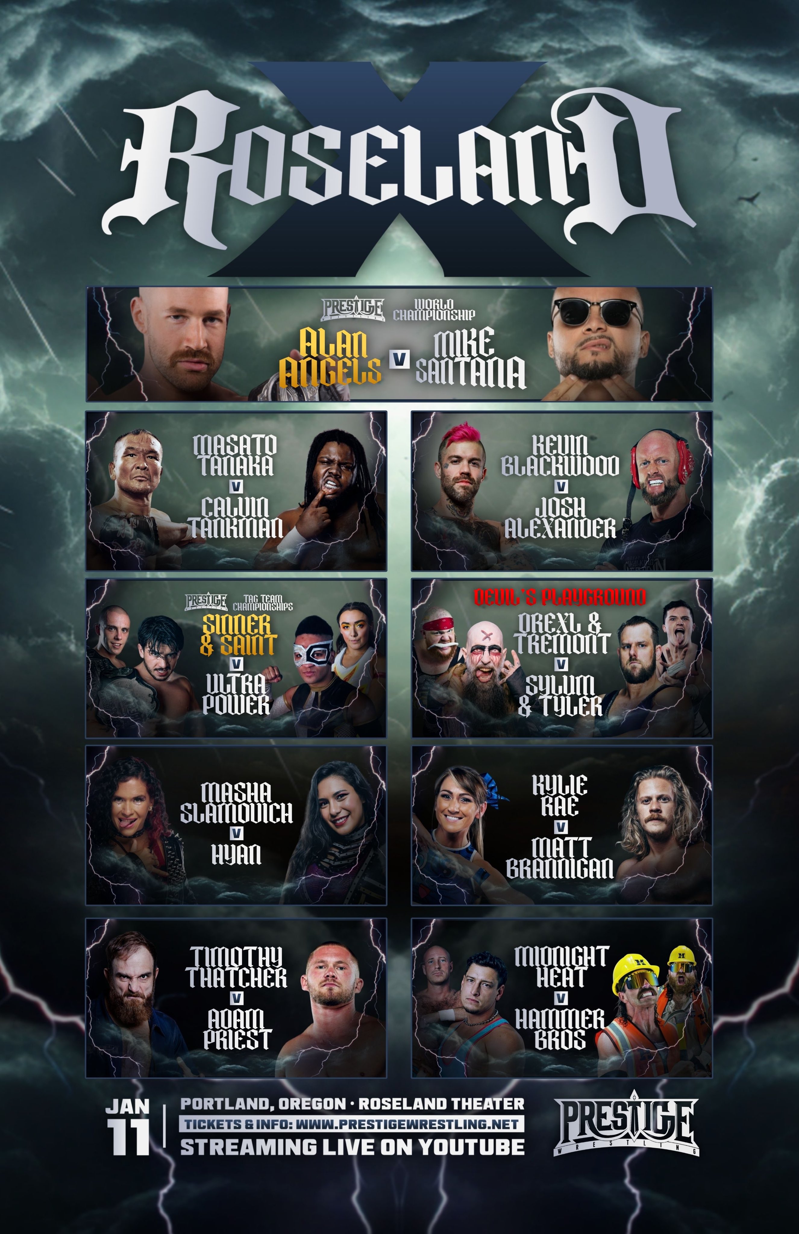 Prestige Wrestling’s next big show, Roseland X, will take place on Saturday, January 11th, 2025 at the Roseland Theater in Portland, Oregon. It will stream live for the cost of FREE starting at 10:00 EST on Prestige’s YouTube channel.