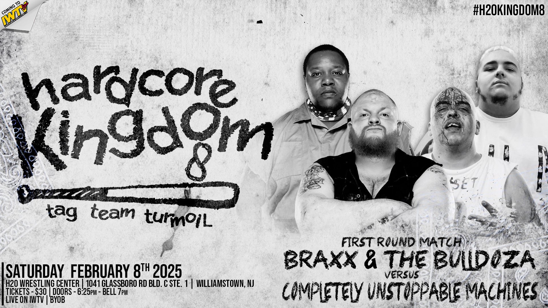 H2O Wrestling 2/8/2025 Hardcore Kingdom 8 results from the H2O Wrestling Center in Williamstown, New Jersey. The event streamed live on IWTV.