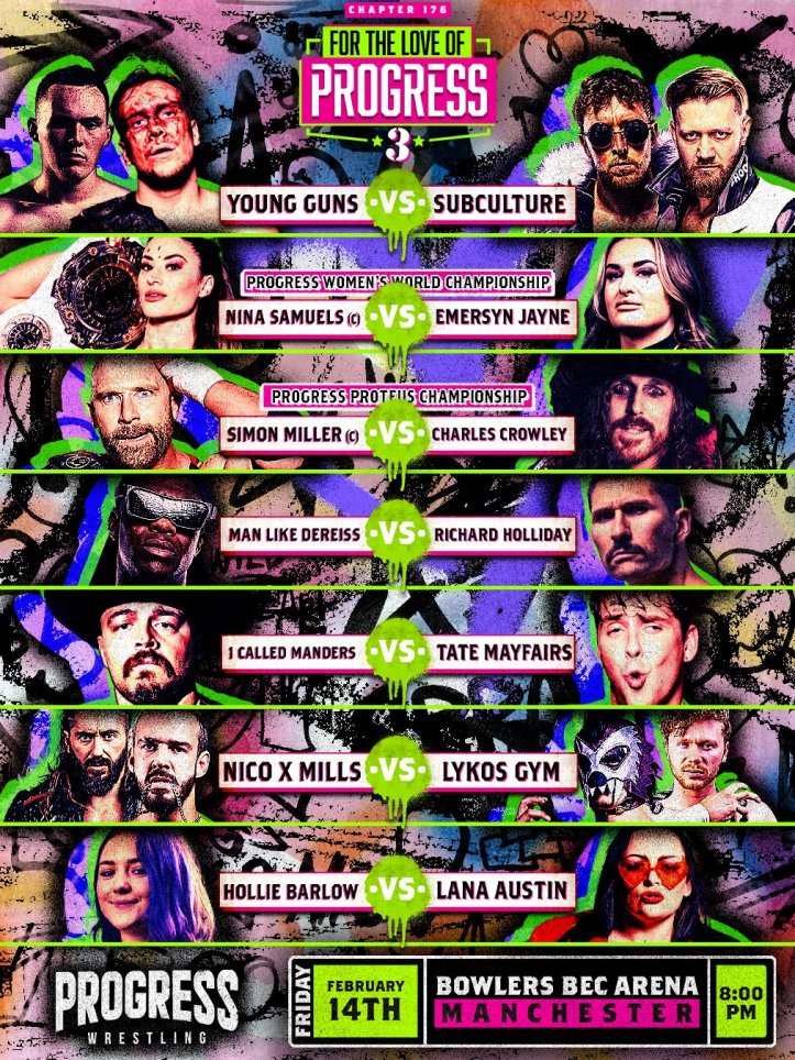 PROGRESS Wrestling 2/14/2025 Chapter 176: For The Love Of Progress 3 results from the Bowlers Bec Arena in Manchester, England. The event streamed live on TrillerTV+.