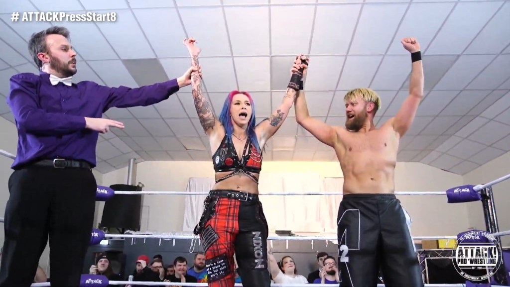 At ATTACK! Pro Wrestling’s “Press Start 8”, the team of Nixon Newell and Mark Andrews, known as Bayside High reunited after over 8 years. The match began when Harrison Bennett and Rayne Leverkusen took the ring to badmouth both ATTACK! and Mark Andrews. Andrews came out and challenged the two to a match. The former WWE superstar now known as Nixon Newell make her suprise entrance through the curtain. Newell picked up the victory for her team after a Shining Wizard to Rayne Leverkusen.