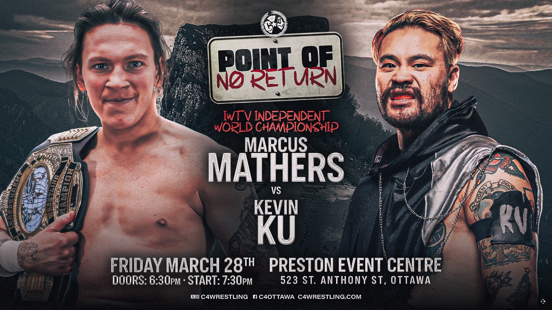 Marcus Mathers will defend the IWTV Independent Wrestling World Championship against Kevin Ku at C4 Wrestling’s “Point Of No Return” on Friday March 28th. This will be Mathers’ sixth defense of the championship since winning it back at Beyond Wrestling’s “Heavy Lies The Crown” on New Year’s Eve.