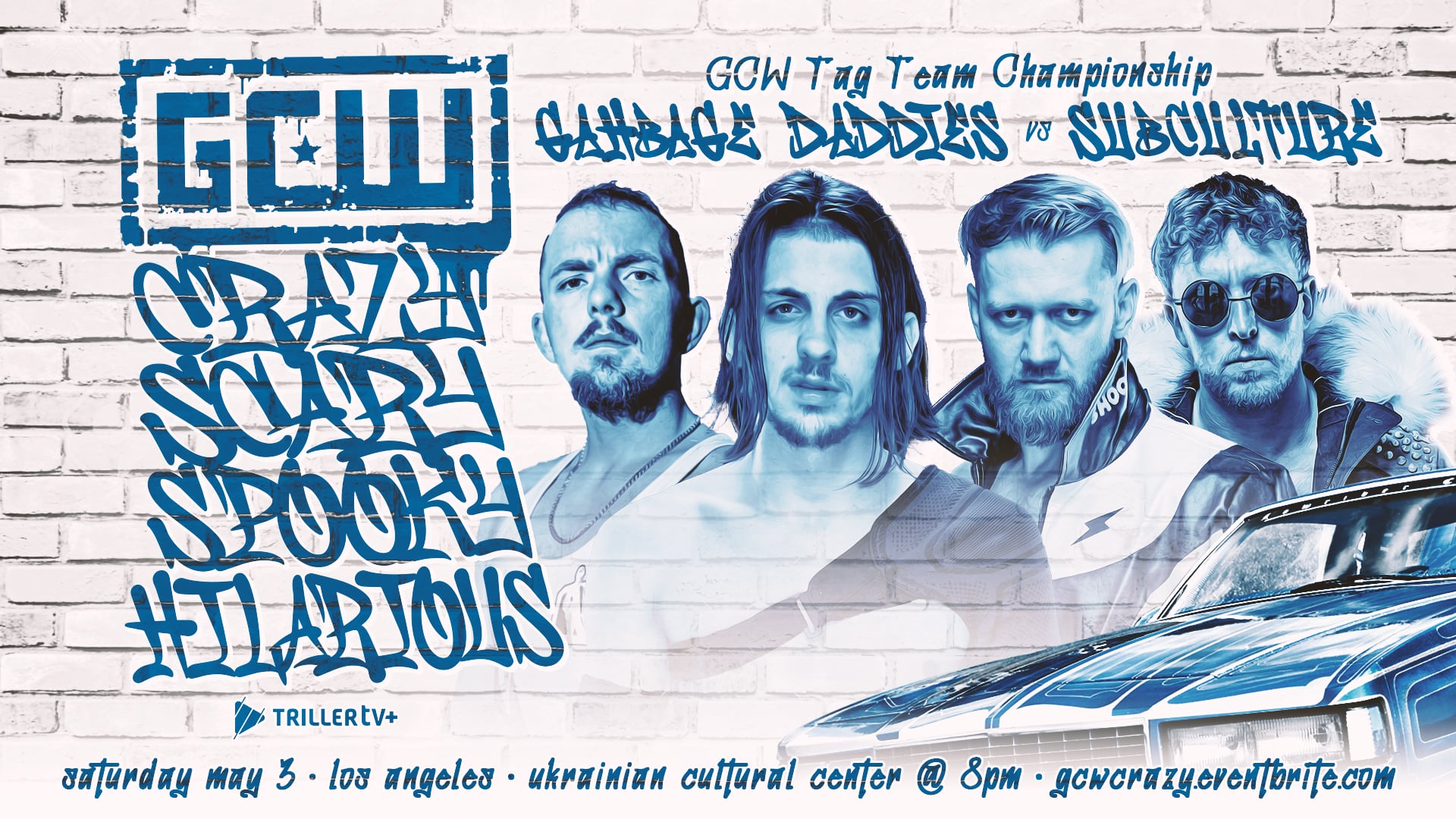 The current GCW Tag Team Champions, Gahbage Daddies will defend the championships against the debuting team of Flash Morgan Webster and Mark Andrews, known as Subculture. The match will take place at GCW’s “Crazy Scary Spooky Hilarious” on Saturday May 3rd at the Ukranian Cultural Center in Los Angeles, California.