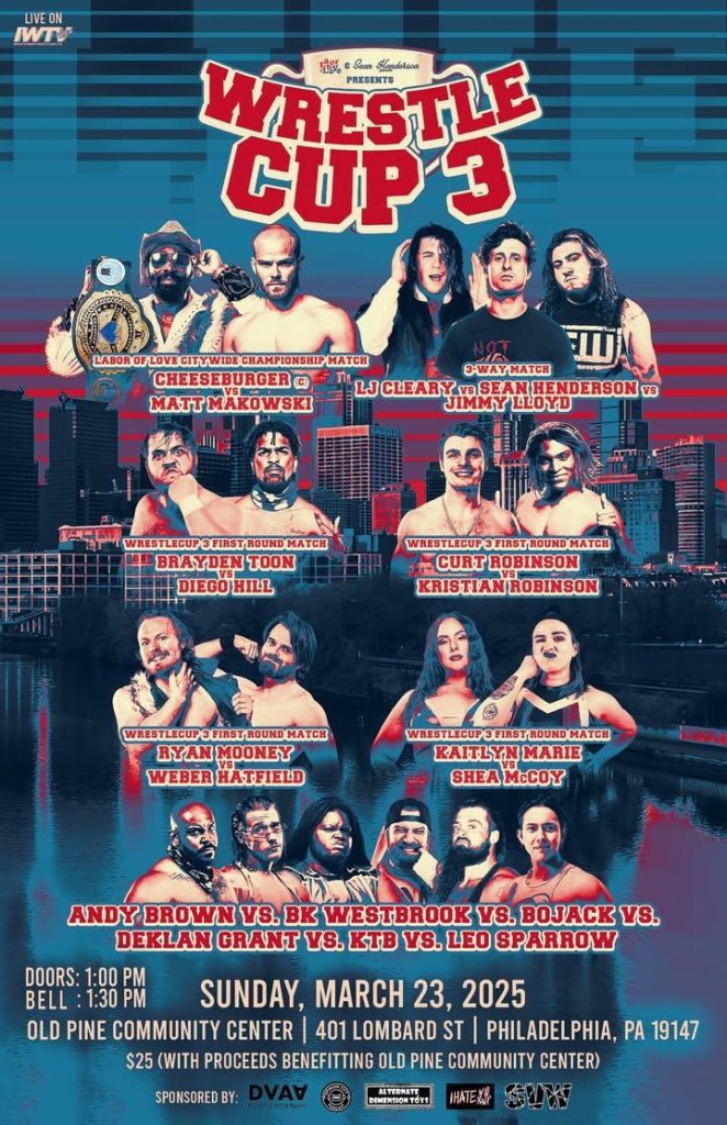 A Labor Of Love/Sean Henderson Presents 3/23/2025 Wrestle Cup 3 results from the Old Pine Community Center in Philadelphia, Pennsylvania. The event streamed live on IWTV.