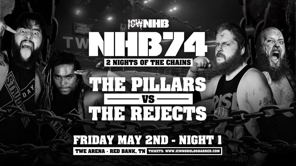 The team of Malcolm Monroe III and Tommy Vendetta, known as The Pillars, will take on The Rejects, John Wayne Murdoch and Reed Bentley. The match will take place at ICW NHB 74 on Friday May 2nd at the TWE Arena in Red Bank, Tennessee. This will be the first of two nights of the chains in Chattanooga. Tickets are available at ICWNOHOLDSBARRED.COM.