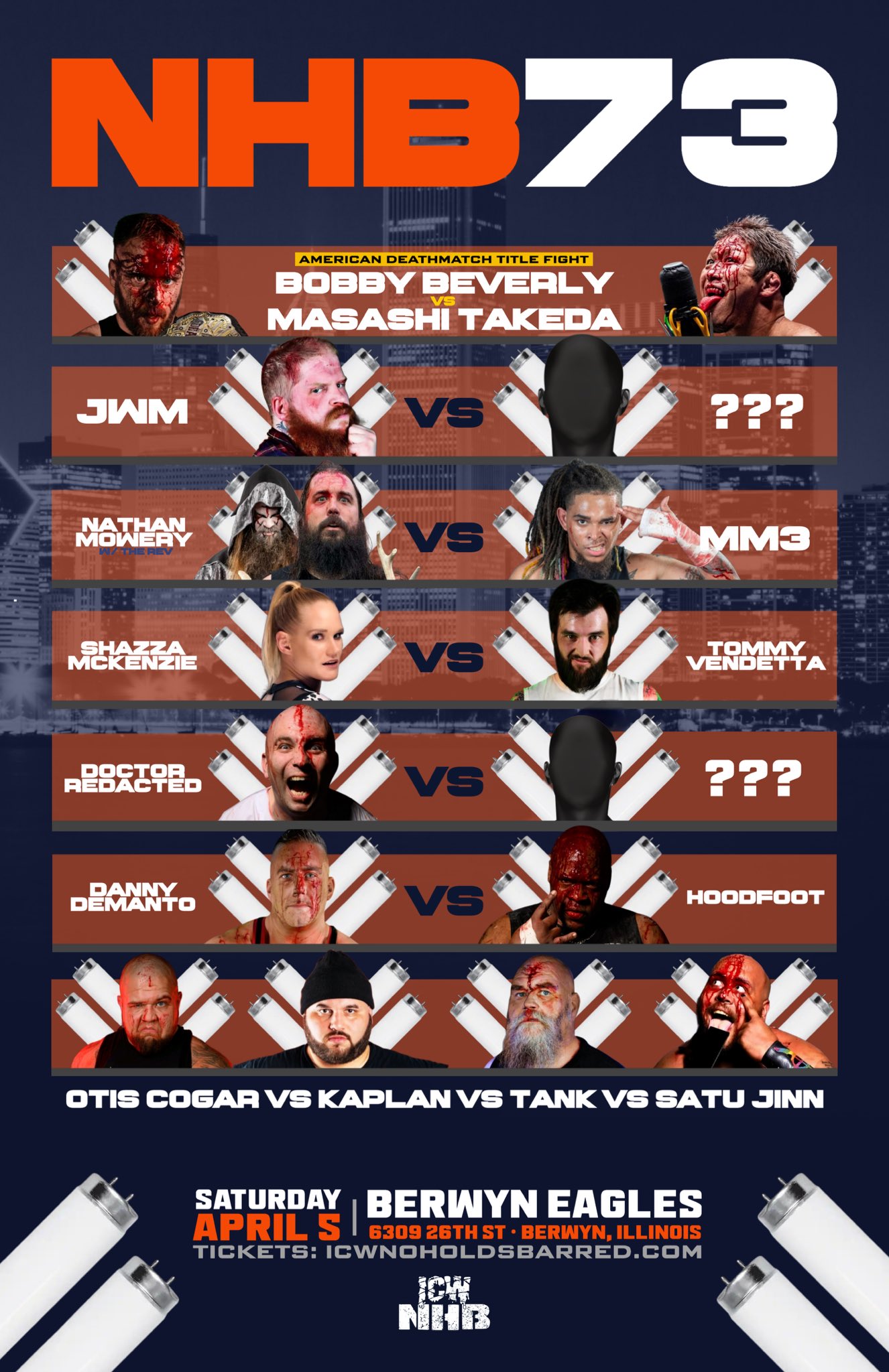 ICW No Holds Barred 4/5/2025 ICW NHB 73 results from the Berwyn Eagles Club in Berwyn, Illinois. The event streamed live on IWTV.