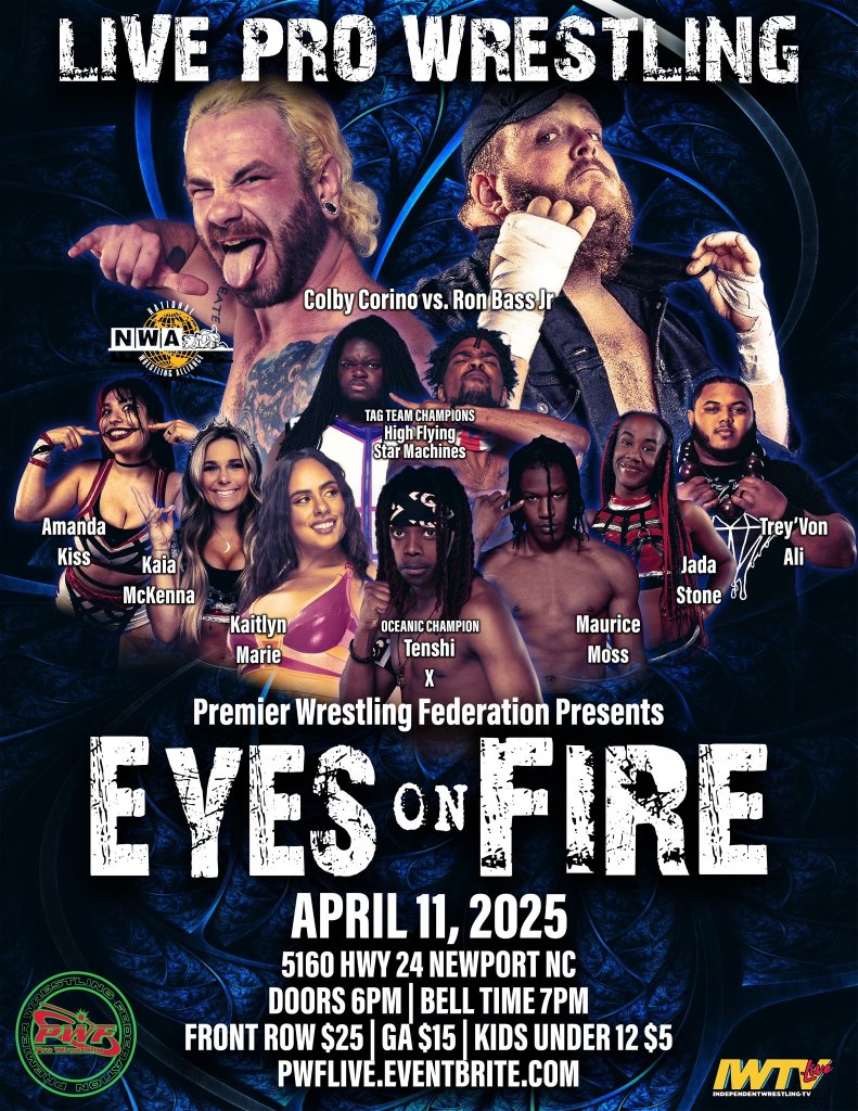 Premier Wrestling Federation 4/11/2025 PWF Eyes On Fire results from the Carolina Wrestling Academy in Newport, North Carolina. The event streamed live on IWTV.