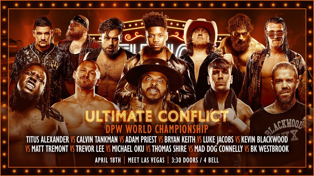 At DPW’s Title Fight In Vegas, 12 competitors will compete for the vacant DPW World Championship in a “Ultimate Conflict” match. It is unclear what the rules of the match are, but the competitors are Titus Alexander, Matt Tremont, Trevor Lee, Michael Oku, Mad Dog Connelly, Thomas Shire, BK Westbrook, Bryan Keith, Calvin Tankman, Adam Priest, Luke Jacobs and Kevin Blackwood. Who will become the 6th DPW World Champion?