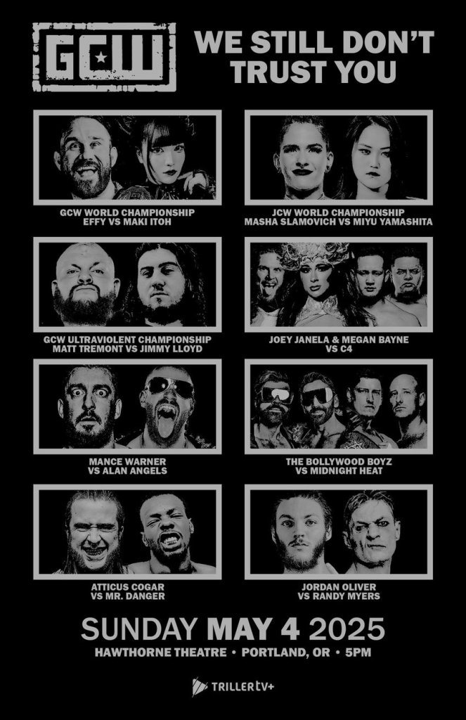 On Sunday, May 4th, Game Changer Wrestling held it’s debut show at the Hawthorne Theater in Portland, OR, “We Still Don’t Trust You.” The event streamed live on TrillerTV+.