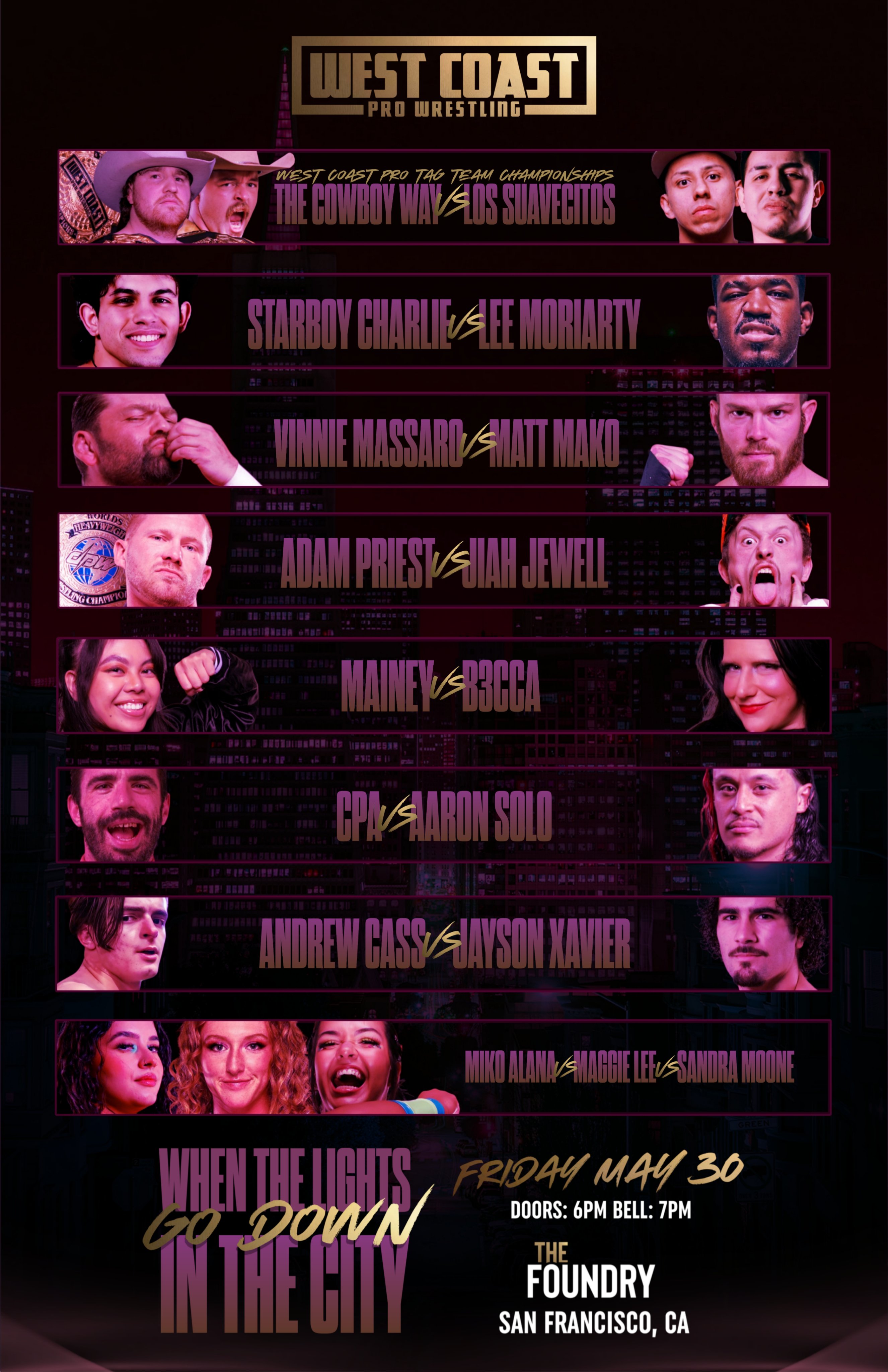On Friday, May 30th, West Coast Pro Wrestling returned to San Francisco, CA, for it’s event, “When The Lights Go Down In The City.” The event streamed live on HighspotsTV.