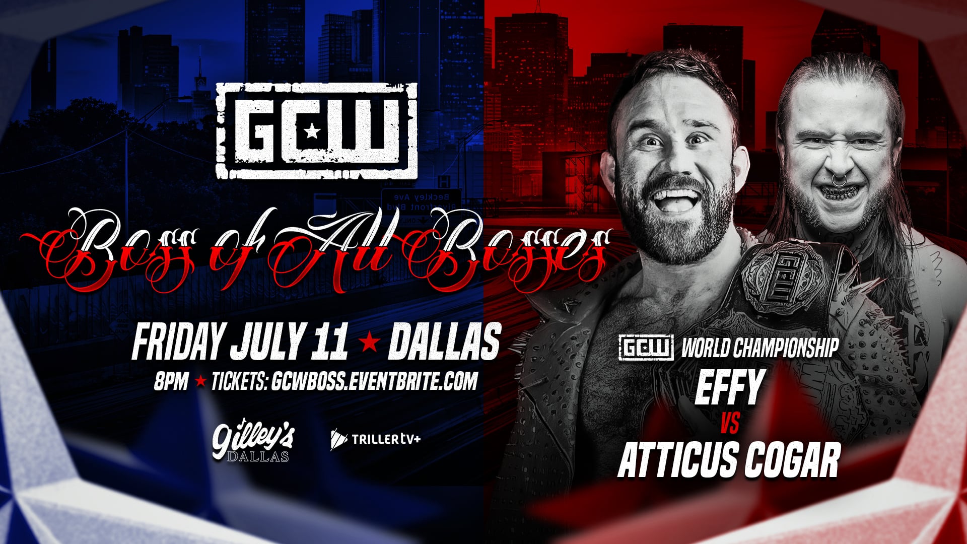 GCW World Champion Effy will defend the championship (if still champion) against Atticus Cogar in Dallas. The huge title match will take place at Game Changer Wrestling’s “Boss Of All Bosses” on Friday July 11th. The two have faced off twice before, with Atticus winning both matches.
