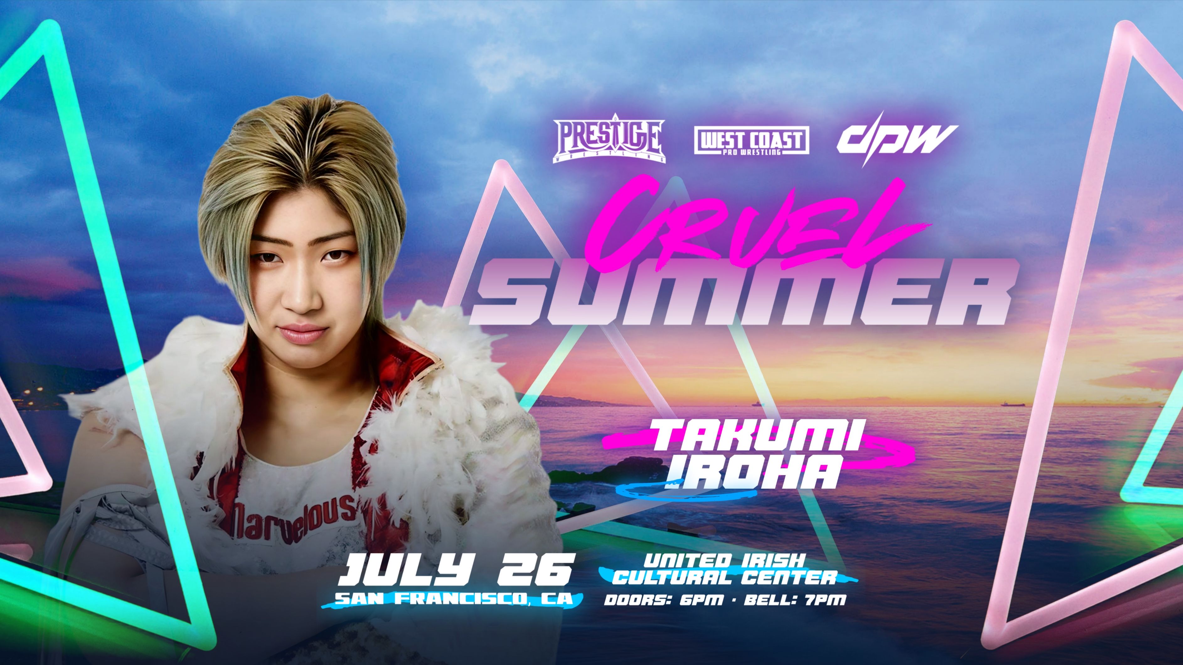 Former West Coast Pro Women’s Champion Takumi Iroha will make her West Coast Pro Wrestling return at Cruel Summer on July 26th. The event is a joint event alongside Deadlock Pro and Prestige Wrestling. It will take place at the United Irish Cultural Center in San Francisco, California. Tickets are available at WestCoastPro.EventBrite.Com.