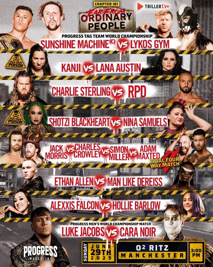 Progress Wrestling 6/29/2025 Chapter 181: Far From Ordinary People results from the O2 Ritz in Manchester, England. The event streamed live on TrillerTV+.