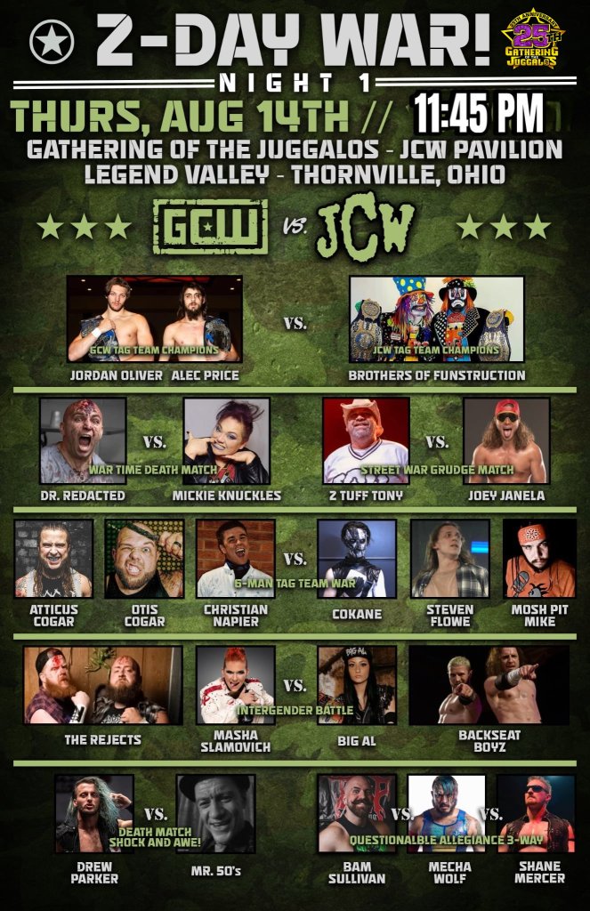 The full card has been announced for Night 1 of Game Changer Wrestling and Juggalo Championship Wrestling’s 2-Day War. The event will take place at the Gathering of the Juggalos on Thursday, August 14th at the JCW Pavilion Legend Valley in Thornville, Ohio.