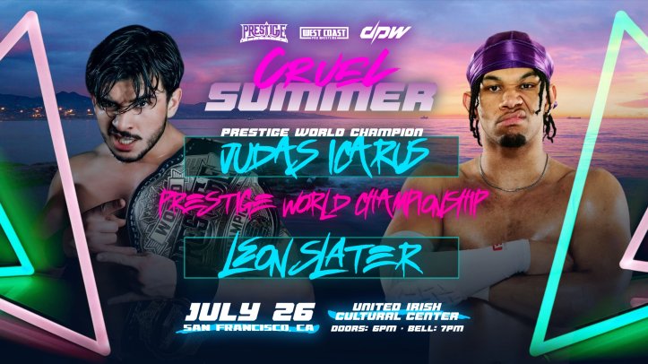 Newly crowned Prestige Wrestling World Champion Judas Icarus will have his first title defense in just ten days, against TNA star Leon Slater. The title match will occur at “Cruel Summer”, the joint event held by Prestige Wrestling, West Coast Pro and Deadlock Pro.