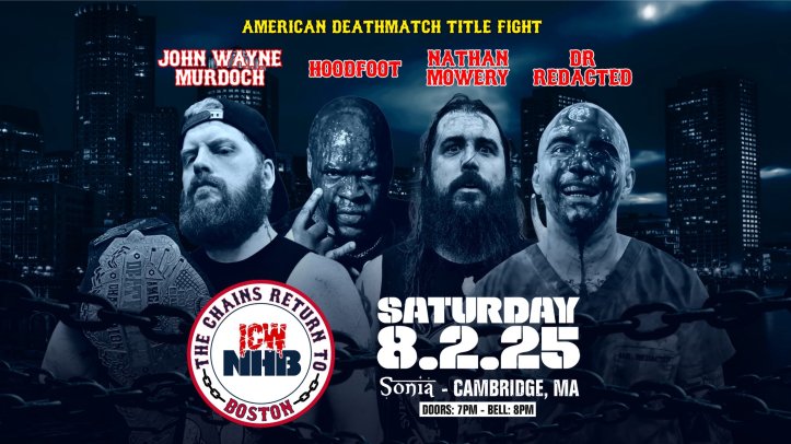 The main event of ICW NHB’s return to Boston will see John Wayne Murdoch defend the American Deathmatch Championship against three other competitors. The “American Deathmatch Ace” will face Hoodfoot, Nathan Mowery and Dr Redacted in a four way match with the title on the line. This will be Murdoch’s fourth title defense since winning the championship back in June.