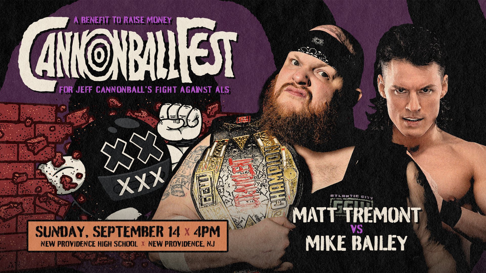 “The Bulldozer” Matt Tremont will take on “Speedball” Mike Bailey in a clash of styles at CannonballFest on Sunday, September 14th. The benefit to raise money for Jeff Cannonball’s fight against ALS will take place at the New Providence High School in New Providence, New Jersey. Tickets go on sale this Friday, August 1st at noon.