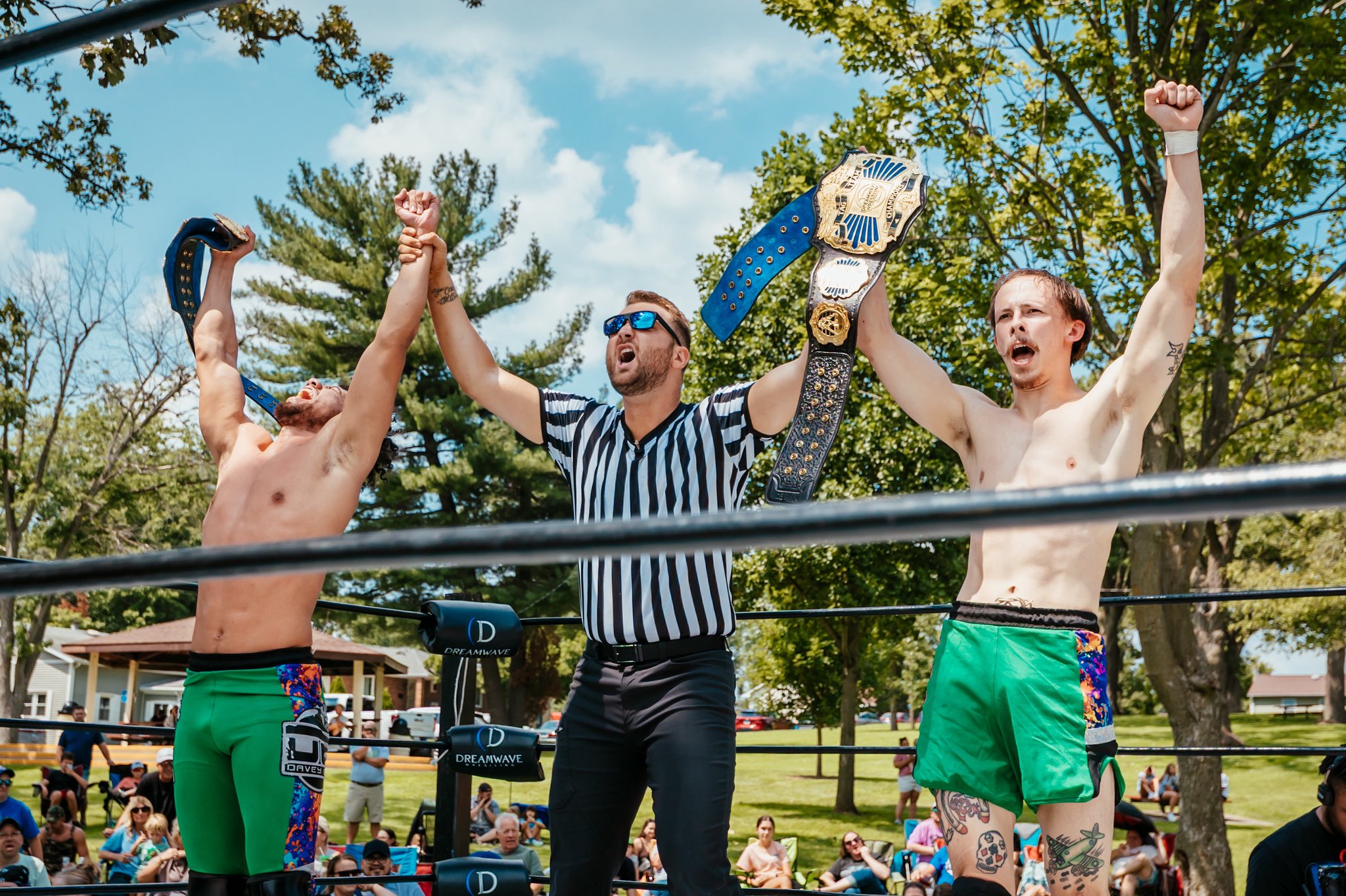 Bang And Matthews (Davey Bang and August Matthews) captured the vacant Dreamwave Tag Team Championships in the finals of the championship tournament. Bang And Matthews defeated Gaige Noonan and Hunter Holdcraft of The Hype at Dreamwave Wrestling’s free event, “Live At The Taste of the Illinois Valley” at Centennial Park in Peru, Illinois.
