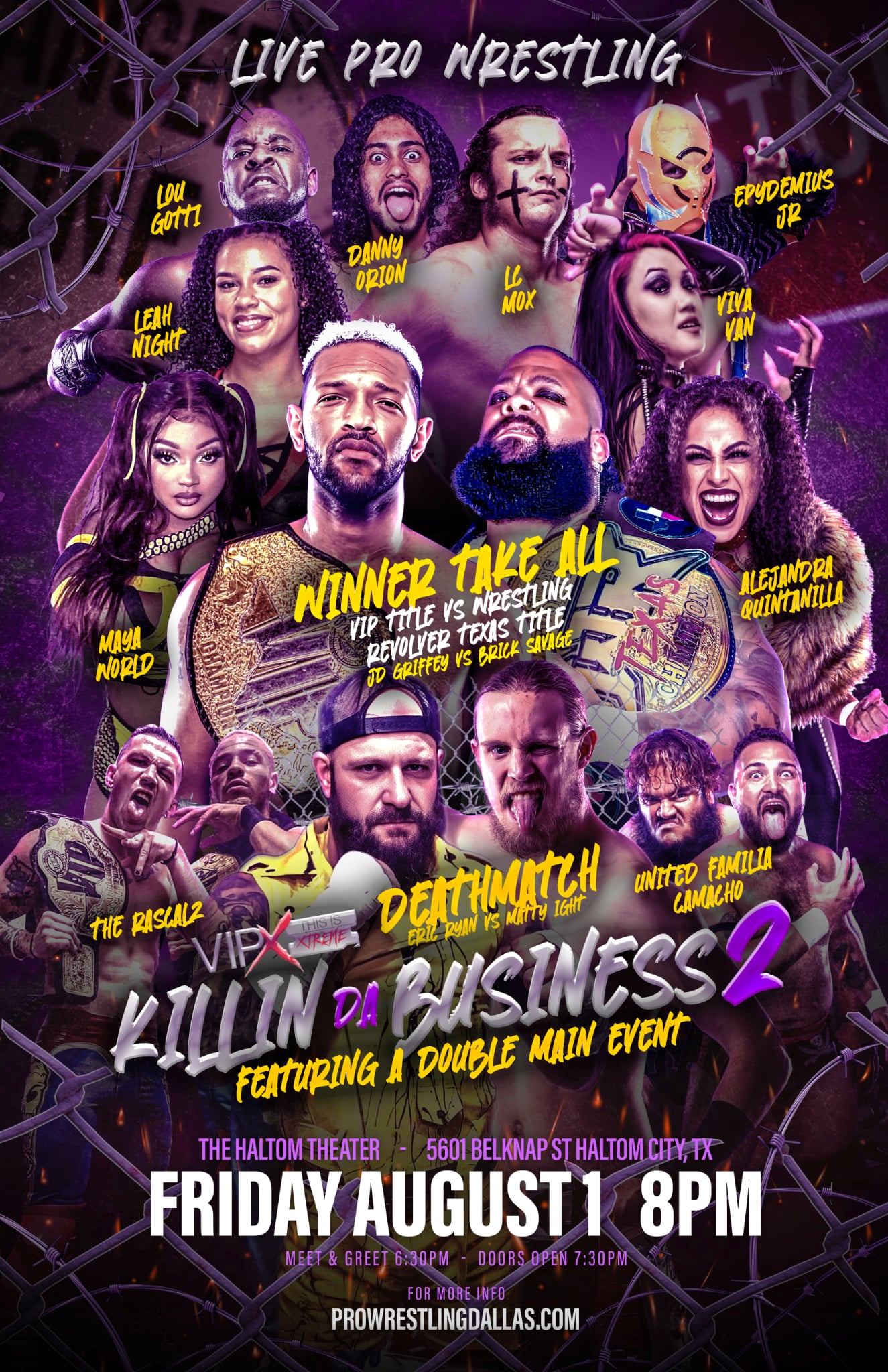 VIP Wrestling 8/1/2025 Killin Da Business 2 results from The Haltom Theater in Haltom City, Texas. This event was broadcast live on TitleMatch Network.