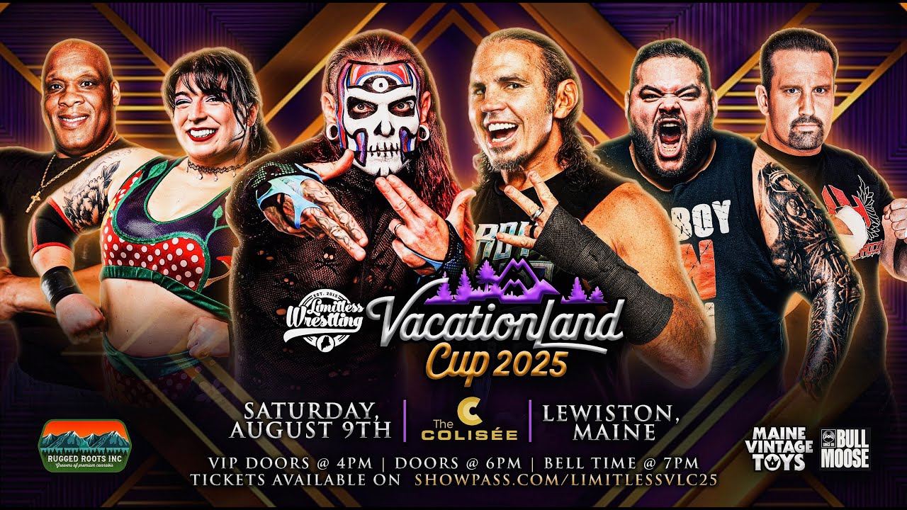 Limitless Wrestling 8/9/2025 Vacationland Cup 2025 results from The Colisée in Lewiston, Maine. The event streamed live on IWTV and YouTube.