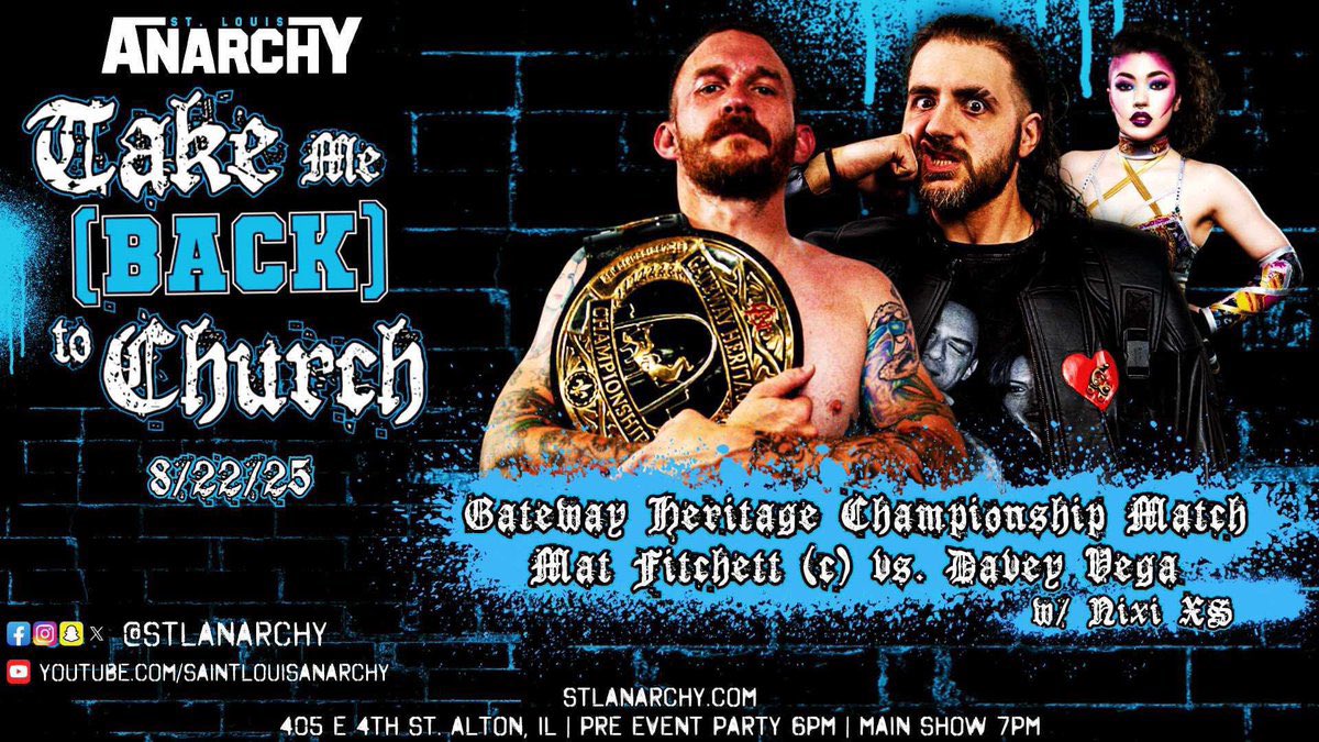 St. Louis Anarchy 8/22/2025 SLA Take Me (Back) To Church results from Spalding Hall in Alton, Illinois. The event streamed live on IWTV.