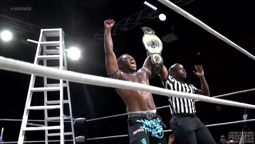 Man Like Dereiss was able to capture the PROGRESS World Championship for the first time when he defeated Luke Jacobs in a Tables, Ladders and Chairs Match in the main event of Chapter 183: 100 Volts. It was the first TLC Match to take place at The Electric Ballroom.