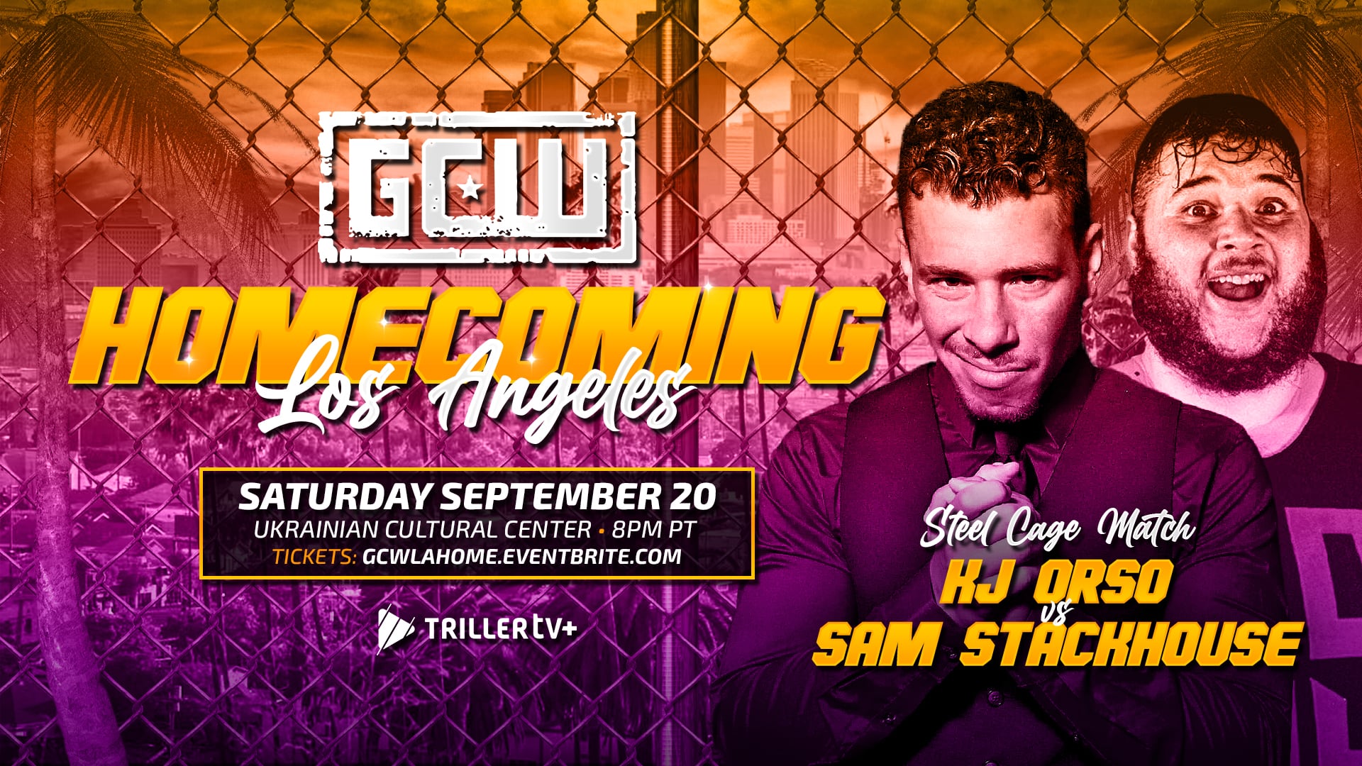 Rivals Sam Stackhouse and the former Fuego Del Sol, KJ Orso will do battle inside a steel cage at GCW Homecoming Los Angeles on Saturday, September 20th. Orso came out the victor in the first match between the two back in July, which was an I Quit Match.