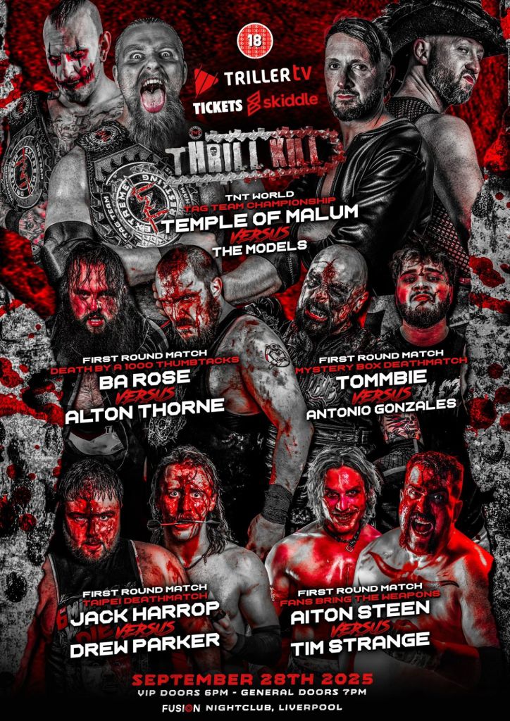 TNT Extreme Wrestling 9/28/2025 Thrill Kill 2025 results from Fusion Nightclub in Liverpool, England. The event streamed live on TrillerTV+.