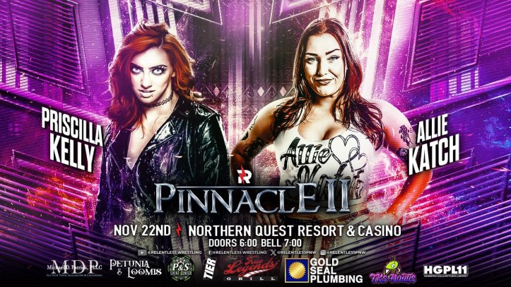 Priscilla Kelly will take on Allie Katch at Relentless Wrestling’s ‘Pinnacle II’ on November 22nd. The event will be held at the Northern Quest Resort & Casino in Washington and will also feature Cedric Alexander, Nic Nemeth, Alan Angels, Kevin Blackwood, Danhausen and more.