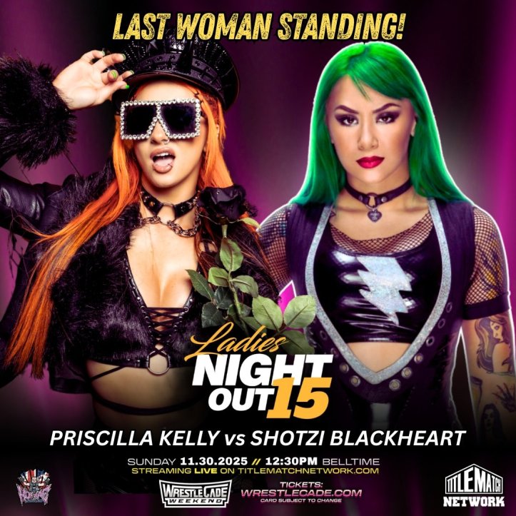 Priscilla Kelly and Shotzi Blackheart take their rivalry to the next level as the two face off in a last woman standing match! Both women go head-to-head at Ladies Night Out 15 at WrestleCade at the Benton Convention Center in Winston-Salem, North Carolina. The event also features Deonna Purrazzo, Maya World, Lacey Lane, Leila Grey, Janai Kai, and others.