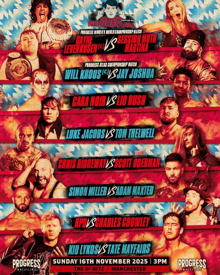 PROGRESS WRESTLING 11/16/2025 Chapter 186: Noisy Neighbours results from the O2 Ritz in Manchester, England. The event streamed live on TrillerTV+.