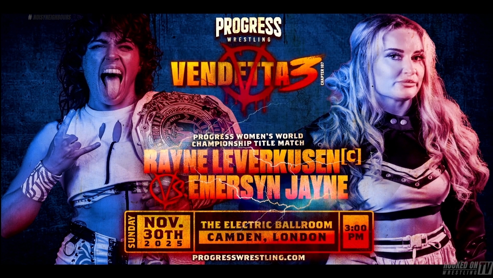 Rayne Leverkusen will defend the PROGRESS Women’s World Championship against Emersyn Jayne at PROGRESS Wrestling’s Chapter 187: Vendetta 3. The announcement took place during today’s Chapter 186 event in Manchester, England. Leverkusen successfully defended the championship against Session Moth Martina on the show.
