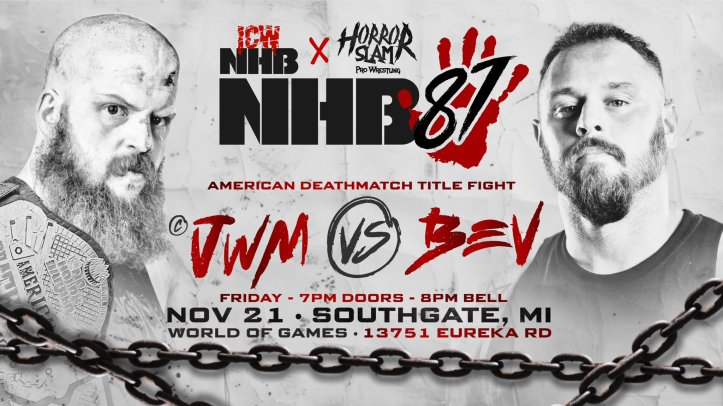 ICW No Holds Barred 11/21/2025 NHB 87 results from World of Games in Southgate, Michigan. The event streamed live on IWTV.