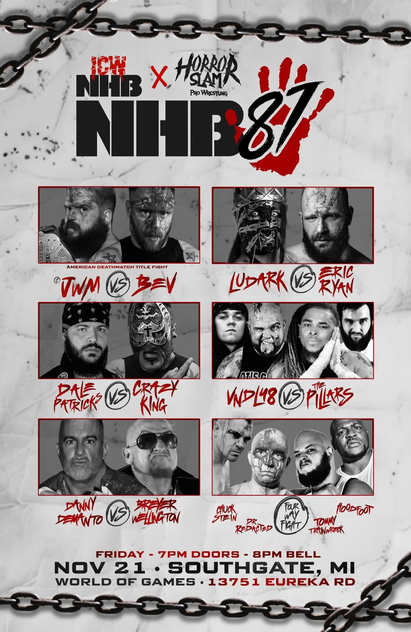 ICW No Holds Barred 11/21/2025 NHB 87 results from World of Games in Southgate, Michigan. The event streamed live on IWTV.