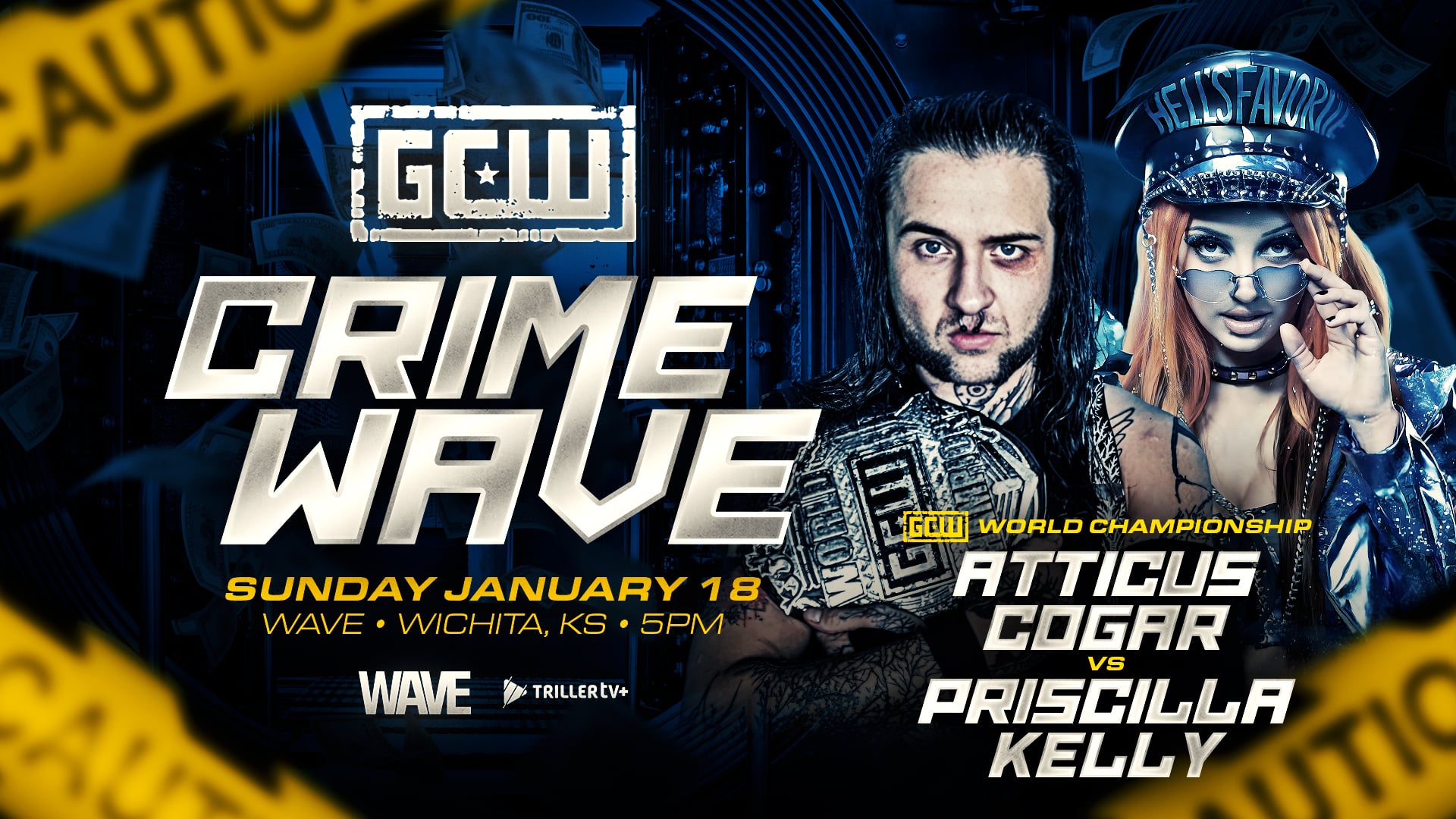 Atticus Cogar will defend the GCW World Championship against Priscilla Kelly at Game Changer Wrestling’s ‘Crime Wave’ on Sunday, January 18th. The first time match up will happen at GCW’s debut in Wichita, Kansas. The show is set to stream live on TrillerTV+.