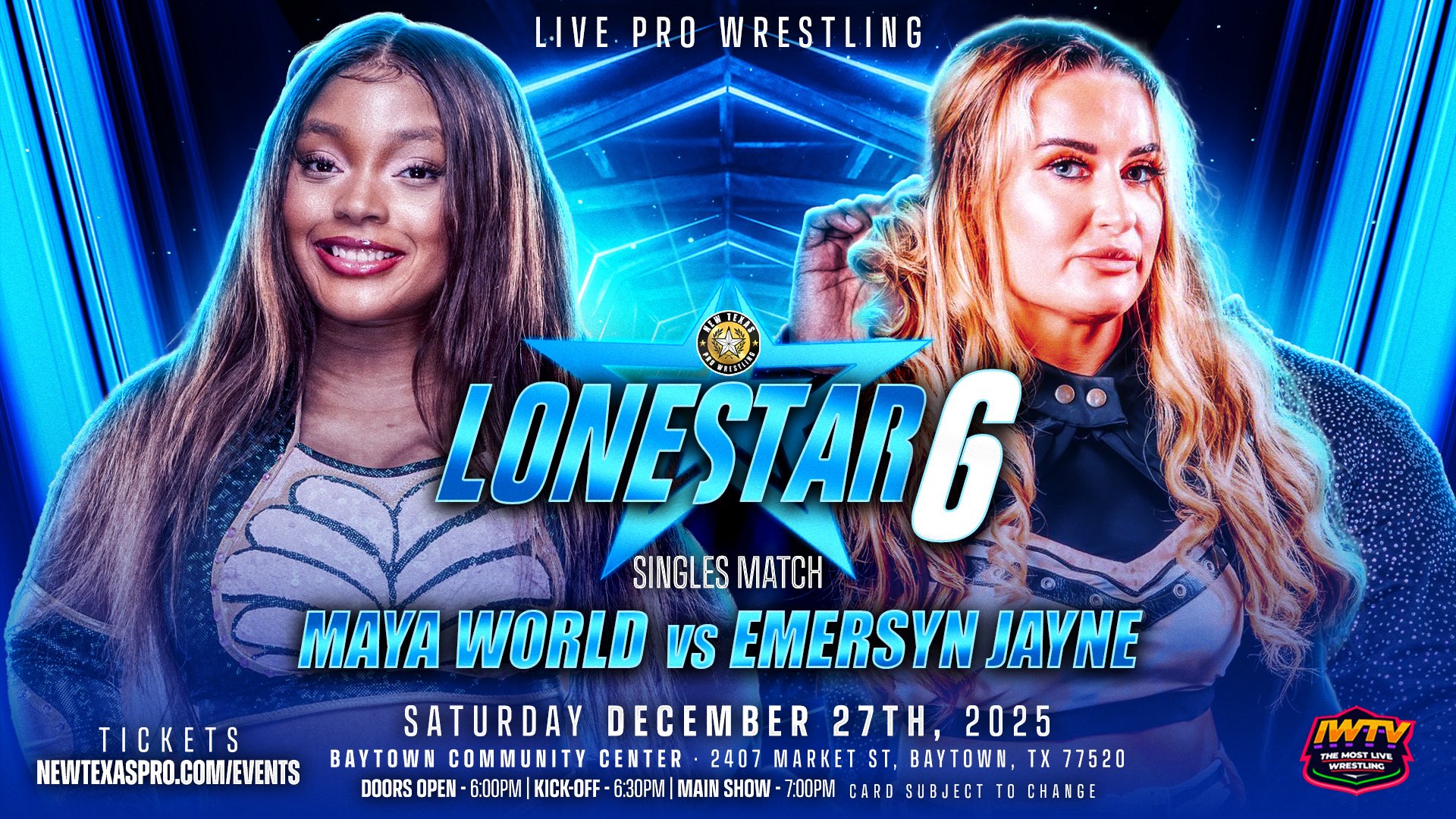 Maya World will take on Emersyn Jayne at New Texas Pro Wrestling’s ‘Lonestar 6’. The event will take place at the Baytown Community Center in Baytown, Texas and is scheduled to stream live on IWTV. 1 Called Manders is scheduled to defend the New Texas Pro Wrestling Championship against Carter Blaq on the same event.