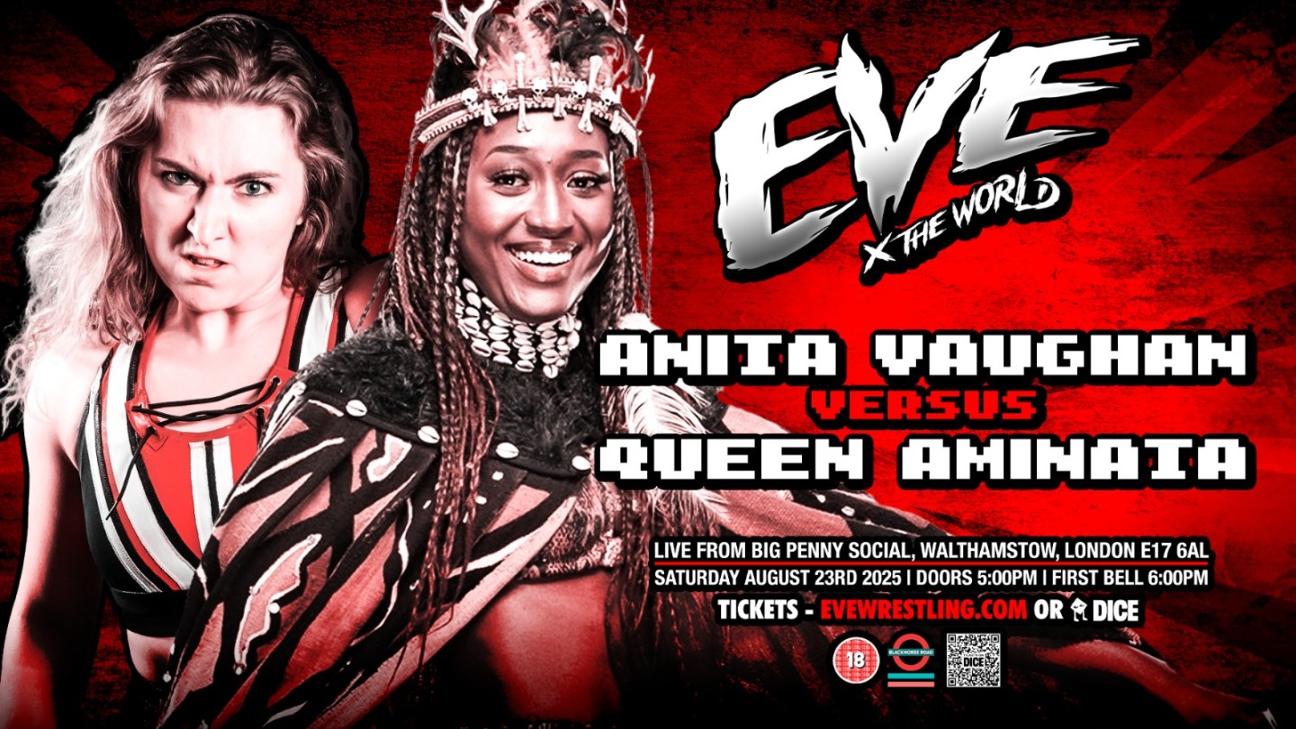 From EVE 138: EVE x The World in London. This is the debut for Aminata in EVE. 20-minute time limit. Vaughan doesn’t go for a handshake, so they tie up and go through a series of reversals. Anita shoulderblocks the Queen down, but Aminata quickly recovers and delivers the Chocolate Kisses sending Vaughan scooting out to the floor. Aminata goes for the facewash boot but misses, hanging in the ropes and gets booted in the face. Backbreaker and a vertical suplex get only one on the Queen. Fallaway slam sends Aminata rolling out to the floor. They trade chops out there, then Anita sends the Queen into the stairs. I learn there are no countouts in EVE as Vaughan boots Aminata back into some chairs. Back in the ring Anita charges the corner but Aminata avoids it and hits about 10 clotheslines in a row, then a snap suplex. Facewash kick in the corner gets two. Running forearm gives her another two count and the Queen heads up top. Doublestomp misses, but a headbutt doesn’t knocking both ladies down. Aminata gets an Air Raid Crash for two. Doublestomp from the top connects this time but only gets two. Vaughan comes back with a roaring elbow and flapjack for two. She goes for a piledriver but gets rolled up for two. Another headbutt and kick to the face gives Aminata the win. ***