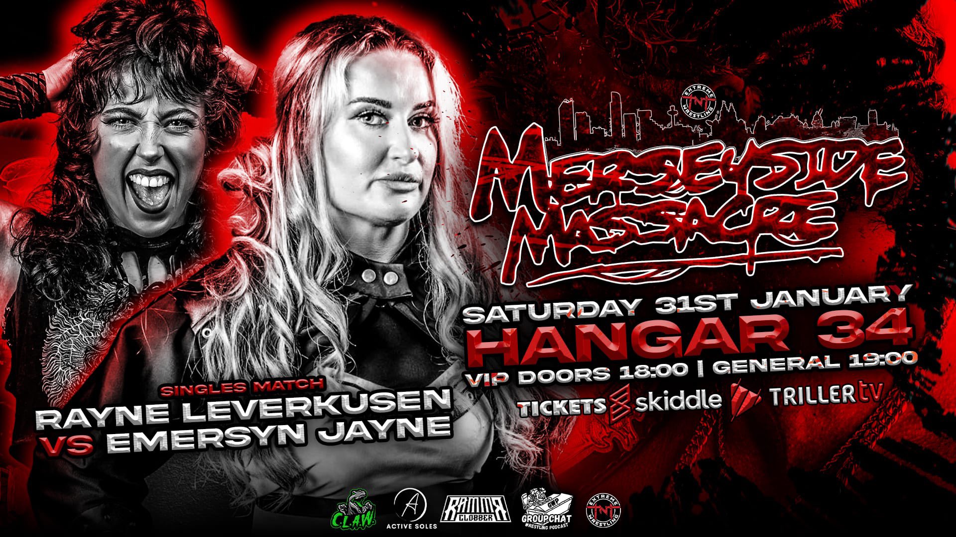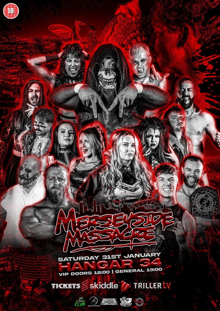 TNT Extreme Wrestling 1/31/2026 Merseyside Massacre results from Hanger 34 in Liverpool, England. The event streamed live on TrillerTV+.