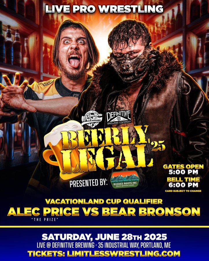 This is a Vacationland Cup qualifying match from the Beerly Legal show. Bear overpowers Price on some lockups and turns him inside out on a shoulderblock. Powerslam and a corner clothesline, followed by some loud chops. Price tries a rana and winds up hitting Code Red, then dropkicks Bronson to the floor. A dive follows that is caught by Bear who press slams him into some “fans” in the crowd. Back in Bronson covers for two. Alec fires up, hitting some running kneestrikes and tries a sunset flip, but Bronson pulls a Bastion Booger and sits down on him for two. Price reverses an Irish whip and hits a pop-up dropkick then a springboard tornado DDT. Bear pulls down the straps and eats some superkicks then tears Price’s head off with a lariat. Black Hole Slam by Bronson gets two. He looks for the Fire Thunder Driver but Price manages to avoid it only to get chokeslam bombed down for two. They head to the top where Price eventually gets an avalanche rana and hits the Surprise Kick for the win. Little bit of a slower pace to this one but still solid. **¾